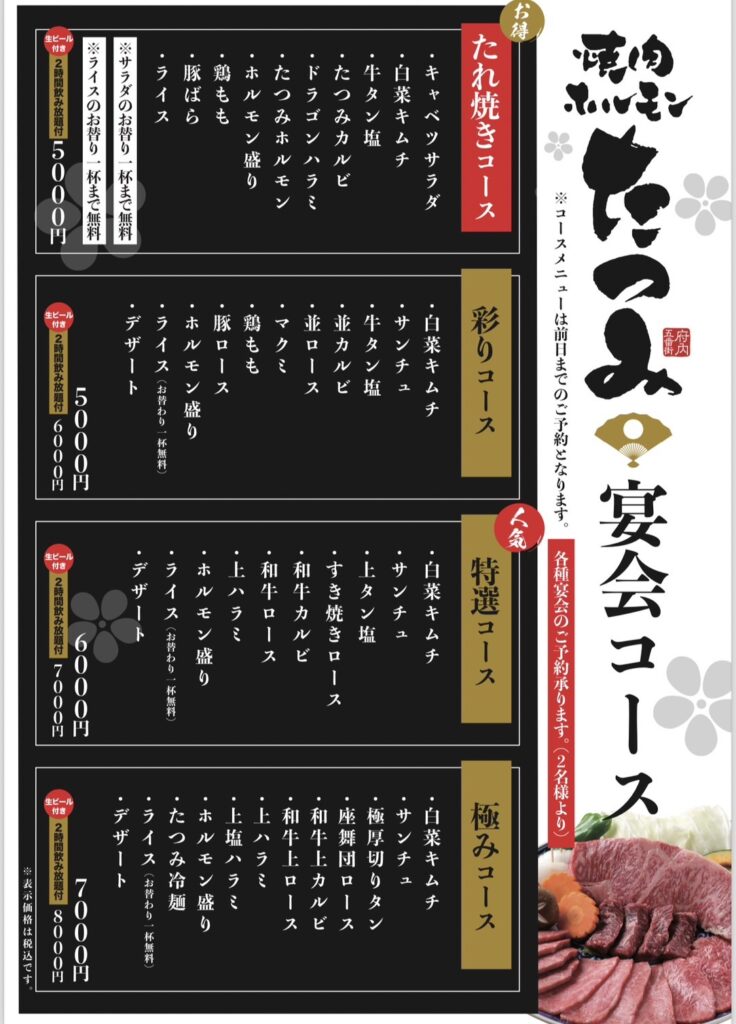 焼肉たつみ宴会コース 2024.11.27 お知らせ 焼肉ホルモンたつみ 宴会コース ※コースメニューは前日までのご予約となります。 ※各種宴会のご予約承ります。(2名様より) 屋台焼肉大丸ホルモン 外装リニューアルいたしました! 前の記事 焼肉ホルモンたつみの焼肉弁当 次の記事