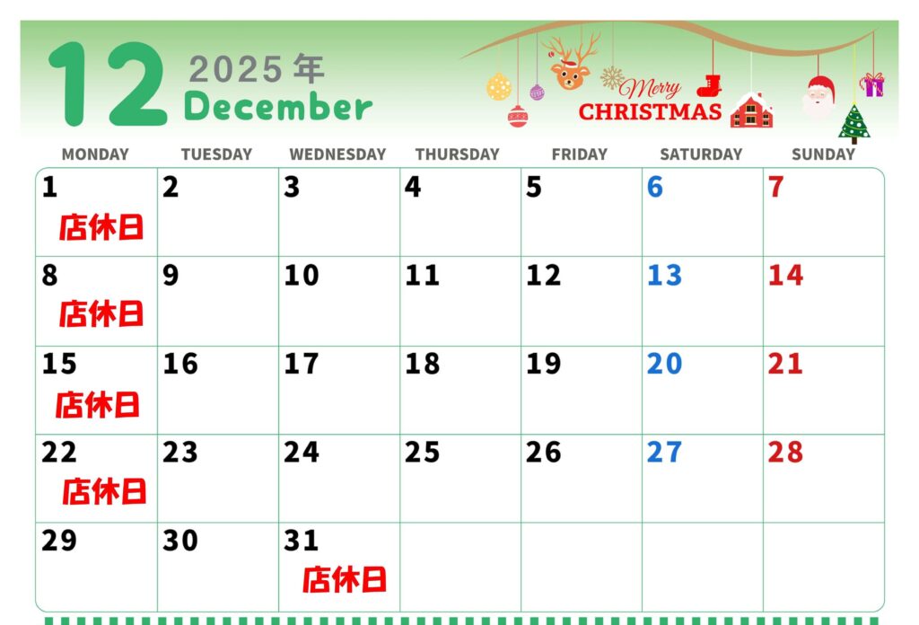 12月店休日のお知らせ 2025.11.30 お知らせ 12月の店休日のお知らせです。 12月は1日・8日・15日・22日・31日となります。 忘年会・新年会のご予約受付中!皆様のお越しをお待ちしております。 11月の店休日のお知らせ 前の記事